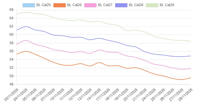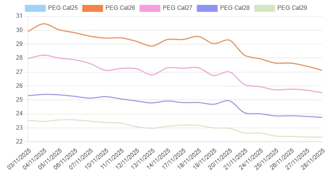 Au fil du mois, le mouvement baissier s’est confirmé sur le marché à terme. Les prix sont revenus à leurs plus bas niveaux depuis le début de l’année, puis ont atteint, en fin de période, leurs plus bas depuis mai 2024 : le PEG CAL-26 s’échange désormais sous les 28 €/MWh. Les perspectives de températures légèrement supérieures aux normales pour début décembre dans le nord-ouest de l’Europe ont continué de freiner la demande de chauffage, tandis que les arrivées de GNL et les flux réguliers en provenance de Norvège ont contribué à rassurer le marché. Les discussions diplomatiques évoquées entre l’Ukraine, les États-Unis et la Russie ont également été perçues comme un facteur de réduction, au moins potentiel, du risque géopolitique.