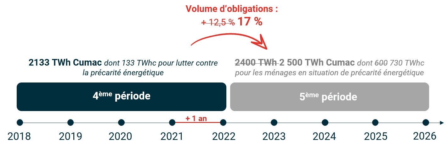 Le niveau global d’obligations pour la 4ème période était fixé à 2133 TWh cumac (TWhc), soit 533 TWhc par an. Pour la 5ème période, le volume d’obligation est revu à la hausse et devrait atteindre 2400 TWhc sur 4 ans, dont 600 TWhc pour lutter contre la précarité énergétique.