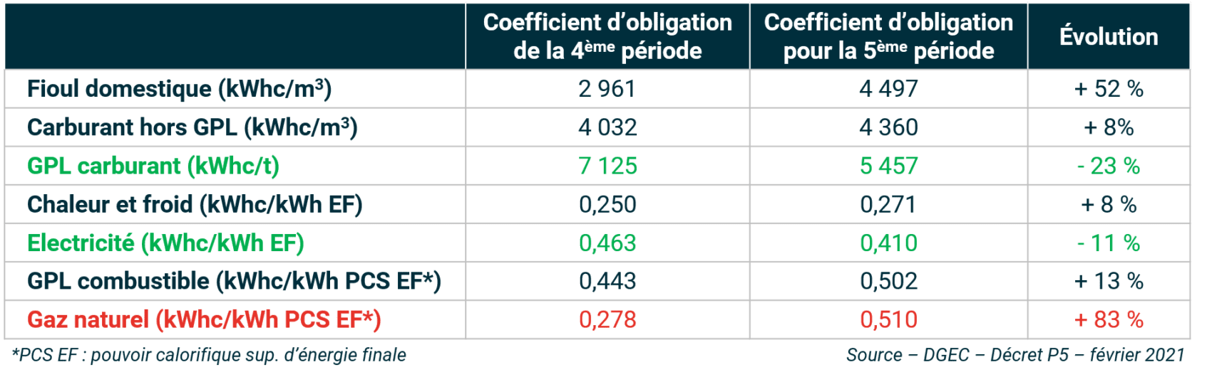Pour cette 5ème période de CEE, l’objectif national de 2400 TWhc a été réparti entre les différentes énergies, en fonction des volumes de vente et non plus selon le prix de l’énergie elle-même. « Le mode de calcul de l’obligation fixée à chaque fournisseur d’énergie évolue, afin d’être plus directement représentatif du volume d’énergie mis sur le marché » explique le ministère de la transition écologique.
