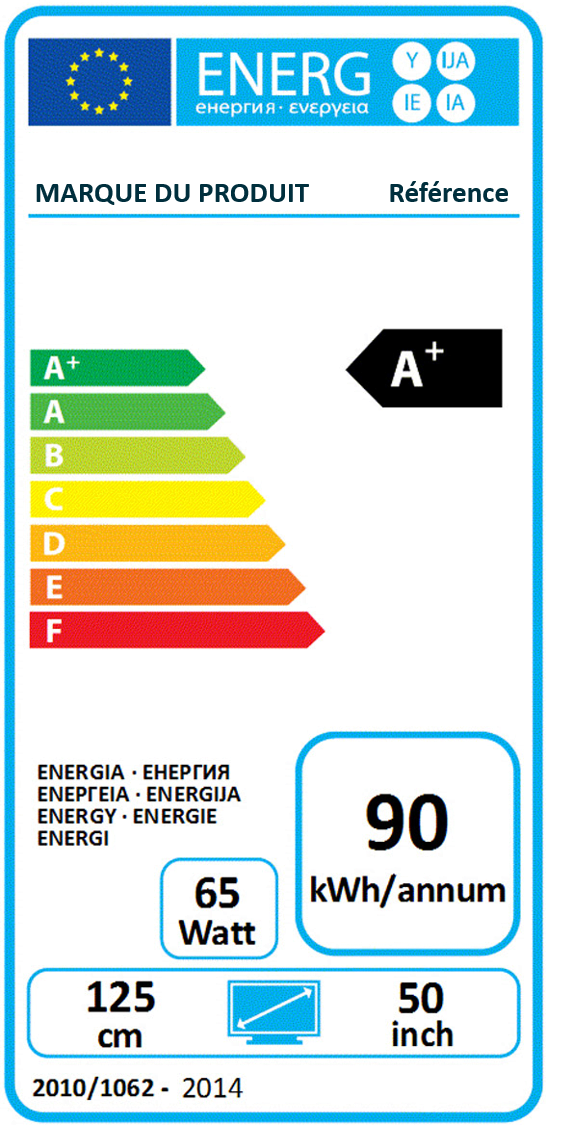 - Des informations diverses suivant le type de produit : il peut s’agir de données sur la consommation, sur l’efficacité, sur la capacité, sur le bruit, etc.
