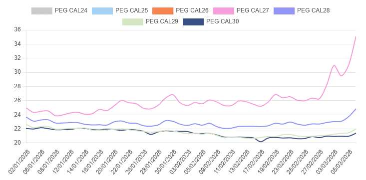 Les tensions persistantes au Moyen-Orient continuent de peser sur les anticipations des acteurs du marché, bien que l’impact sur les prix européens reste modéré. Le PEG CAL27 évolue actuellement autour de 36 €/MWh.